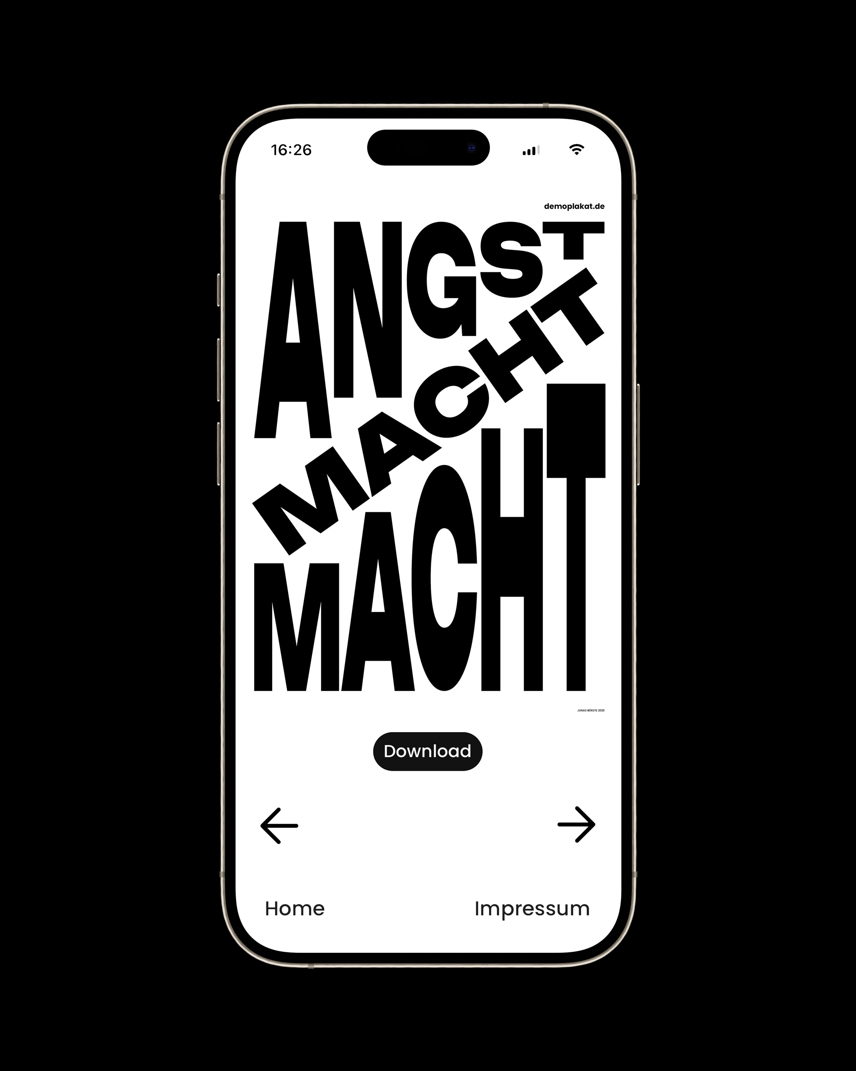 Das gesamte Projekt wurde von mir eigenständig und in freier Initiative konzipiert und umgesetzt – von der Plakatgestaltung, über das Design der Website (demoplakat.de) bis hin zur kommunikativen Ausrichtung. Ein zentrales Anliegen war dabei eine möglichst einfache und barrierearme Nutzung: Ein Klick, ein Ausdruck – und das Statement ist bereit für die Straße.